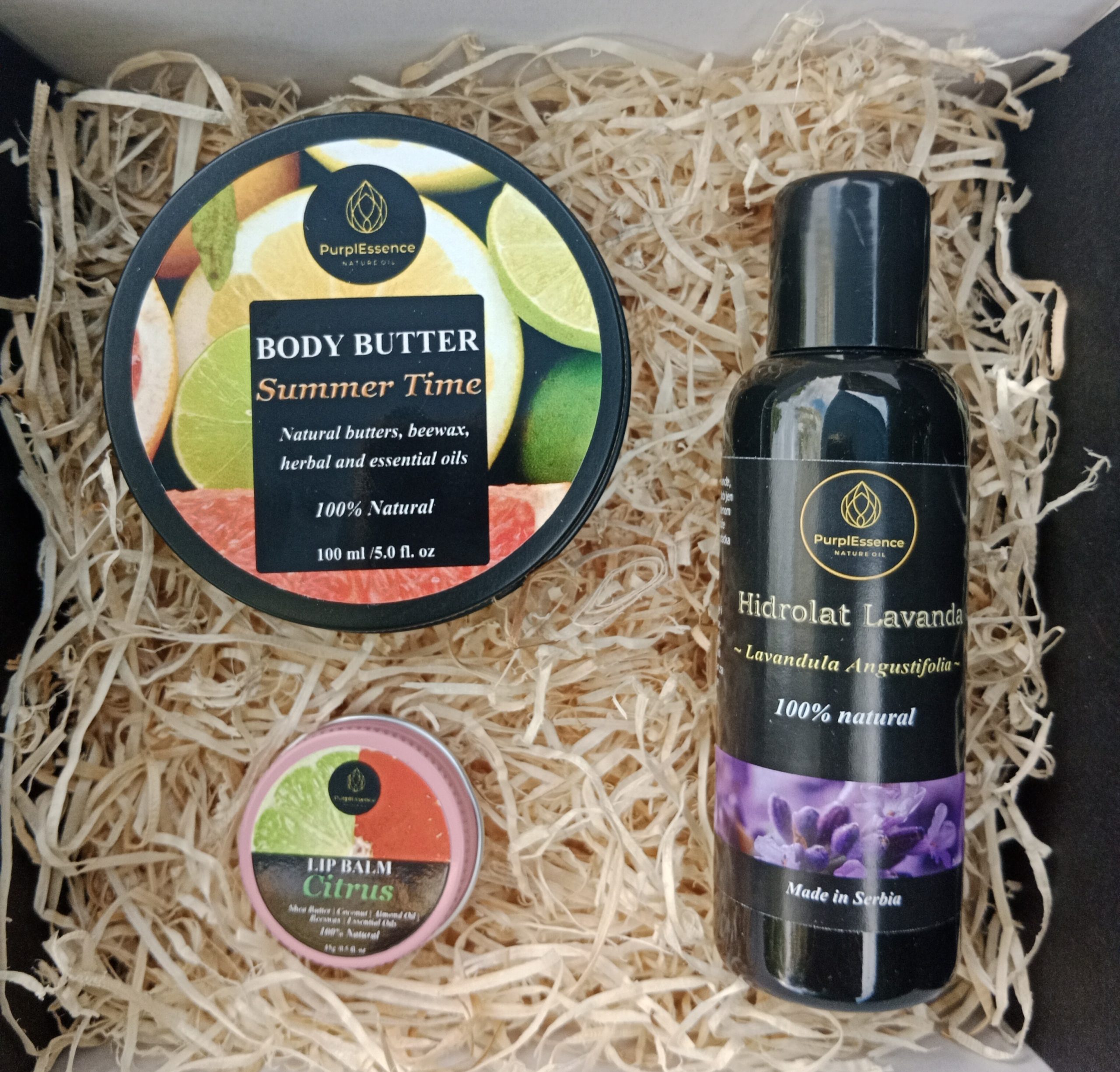 Svaki poklon paket sadrži pažljivo odabrane proizvode kao što su balzami za usne, puteri za telo, proizvode za muškarceeterično ulje i hidrolat lavande, kao i delicije sa lavandom.